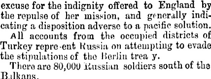 excuse for the indignity offered to England by the repulse of her mission, and generally indicating a disposition adverse to a pacific solution. All accounts from the occupied districts of Turkey repre ent Russia on attempting to evade the stipulations of the Berlin trea y. There are 80,000 Russian soldiers south of the B dkans.