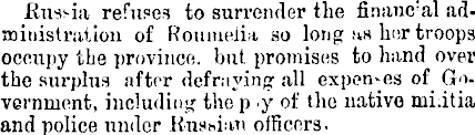 Russia refuses to surrender the financ al administration of Roumeiia so long as her troops occupy the province, but promises to hand over tbc surplus after defraying all expen-es of Government, including the p y of the native mi.itia and police under Russian officers.