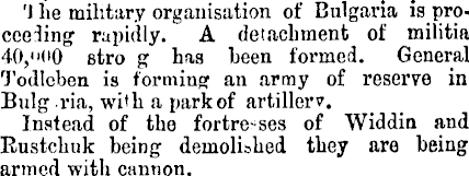'I he military organisation of Bulgaria is proceeding rapidly. A detachment of militia 40,'>(»0 stro g has been formed. General Todloben is forming an army of reserve in Bulg via, with a park of artillerv. Instead of the fortre-ses of Widdin and Rustchuk being demolished they are being armed with cannon.