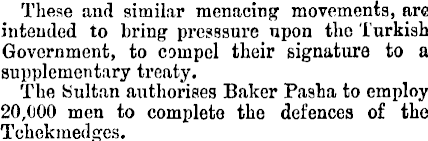 These and similar menacing movements, are intended to bring presssure upon tbc Turkish Government, to compel their signature to a supplementary treaty. The Sultan authorises Baker Pasha to employ 20,000 men to complete the defences of the Tcbekmedgcs.