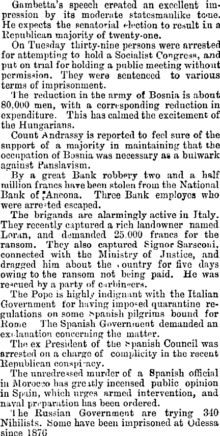 Gambetta’s speech created an excellent impression by its moderate statesmanlike tome. He expects the senatorial election to ro.->ult in a Republican majority of twenty-one. On Tuesday thirty-nine persons were arrested for attempting to hold a Socialist Congress, and put on trial for holding a public meeting without permission. They were sentenced to various terms of imprisonment. The reduction in the army of Bosnia is about 80,000 men, with a corresponding reduction in expenditure. This has calmed the excitement of the Hungarians. Count A ndrassy is reported to feel sure of the support of a majority in maintaining that the occupation of Bosnia was necessary aa a bulwark against Panslavism. By a great Bank robbery two and a half million francs have been stolen from the National Bank of ‘Ancona. Three Bank employes who were arre-ted escaped. The brigands arc alarmingly active in Italy. They recently captured a rich landowner named Loran, and demanded 25.000 francs for the ransom. They also captured Signor Sarsconi, connected with the Ministry of Justice, and dragged him about the . ountry for five days owing to the ransom not being paid. He was rescued by a party of carbineers. The Pope is highly indignant with the Italian Government tor having imposed quarantine regulations on some ."'panisli pilgrims bound for Rome The Spanish Government demanded an explanation concerning the matter. The ex President of the Spanish Council was arrested on a charge of complicity in the recent Republican eonspi acy. The nnredressed murder of a Spanish official in Morocco has gre vtly incensed public opinion in Spain, which urges armed intervention, and naval preparation has been ordered. Ihe Russian Government are trying 310 Nihilists. Some have been imprisoned at Odessa since 1870
