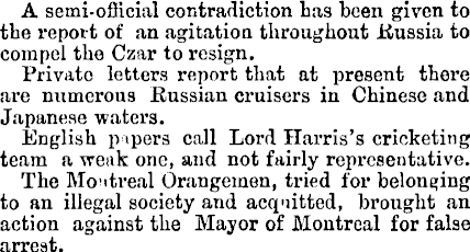 A scmi-oilicial contradiction Las been given to tbe report of an agitation throughout Russia to compel the Czar to resign. Private letters report that at present there are numerous Russian cruisers in Chinese and Japanese waters. English p 'pers call Lord Harris’s cricketing team a weak one, and not fairly representative. The Montreal Orangemen, tried for belonging to an illegal society and acquitted, brought an action against the Mayor of Montreal for false arrest.