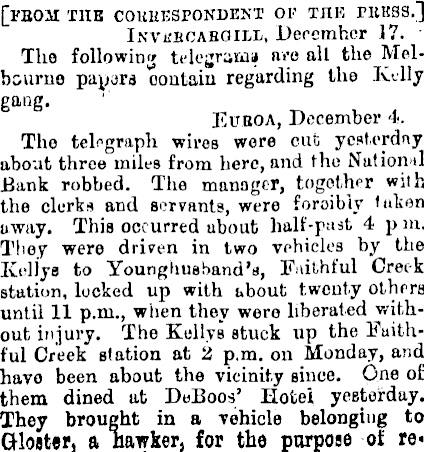 [PROM THE CORRESPONDENT OF THE PRESS.] Invercargill, December 17. The following telegrams are alt the Melbourne papers contain regarding the Kelly gang. Euboa, December 4. The telegraph wires wore cut yesterday about three miles from here, and the National Bank robbed. The manager, together with the clerks and servants, were forcibly taken away. This occurred about half-past 4 p m. They were driven in two vehicles by the Kellys to Youngluisband’s, Faithful Greek station, locked up with about twenty others until 11 p.m., when they were liberated without injury. The Kellys stuck up the Faithful Creek station at 2 p.m. on Monday, and have been about the vicinity since. One of them dined at Deßoos’ Hotel yesterday. They brought in a vehicle belonging to Glo«ter, a hawker, for the purpose of re-