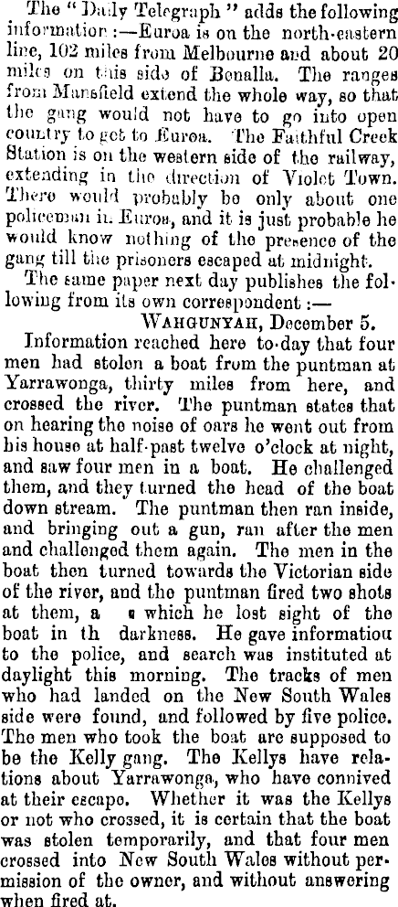The “ Daily Telegraph ” adds the following information :—Euroa is on the north-eastern line, 102 miles from Melbourne and about 20 nnhs on tins side of Benalla. The ranges from Mansfield extend the whole way, so that the gang would not have to go into open count ry to get to Euroa. the Faithful Creek Station is on the western side of the railway, extending in the direction of Violet Town. There would probably bo only about one policeman in Euroa, and it is just probable he would know nothing of tho presence of the gang till tiie prisoners escaped at midnight. The tame paper next day publishes the following from its own correspondent:— Wahounyaji, December 5, Information reached here to-day that four men had stolon a boat from the puntman at Yarrawonga, thirty miles from here, and crossed the river. The puntman states that on hearing tho noise of oars lie went out from his house at half-past twelve o’clock at night, and saw four men in a boat. He challenged them, and they t urned tho head of tho boat down stream. The puntman then ran inside, and bringing out a gun, run after tho men and challenged them again. The men in the boat then turned towards tho Victorian side of the river, and tho puntman fired two shots at them, a n which he lost sight of tho boat in (h darkness. He gave information to tho police, and search was instituted at daylight this morning. Tho tracks of men who had landed on the New South Wales side were found, and followed by five police. Tho men who took the boat are supposed to be the Kelly gang. The Kellys have relations about Yarrawonga, who have connived at their escape. Whether it was tho Kellys or not who crossed, it is certain that the boat was stolen temporarily, and that four men crossed into Now South Wales without permission of the owner, and without answering when fired at.
