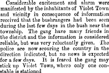 Considerable excitement and alarm were manifested by the inhabitants of Violet Town and vicinity in consequence of information received that the bushrangers had been seen during the last few days in tho bush near the township. The gang have many friends in the district aud the information is considered reliable, but was very reluctantly given. The police are now scouring tho country in the direction indicated, but no nows is expected for a few days. It is feared the gang may stick up Violet Town, where only one constable is stationed