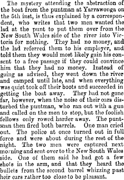 The mystery attending the abstraction of the boat from the puntman at Yarrawonga on the sth inst, is thus explained by a correspondent, who writes that two men wanted the lad at the punt to put them over from the Now South Wales side of the river into Victoria for nothing. They had no money, and the lad referred them to his employer, and told them they would most likely gain his consent to a free passage if they could convince him that they had no money. Instead of going as advised, they went down the river and camped until late, and when everything was quiet took off their boots and succeeded in getting tho boat away. They had not gone far, however, when the noise of their oars disturbed the puntman, who ran out with a gun and called on tho men to stop, but tho foolish fellows only rowed harder away. The puntman then fired both barrels. One man cried out. The police at once turned out in full force and were about during the rest of the night. Tho two men were captured next morning and sent over to the New South Wales side. One of them said he had got a few sho's in (he arm, and that they heard the bullets from the second barrel whizzing past heir cars rather too close to bo pleasant.