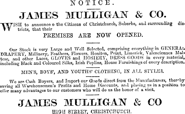 NOTICE. JAMES MULLIGAN & CO. WISH to announce o the Citizens of Christchurch, Suburbs, and surrounding districts, that their PREMISES ARE NOW OPENED. Our Stock is very Largo and Well Selected, comprising everything in GENEKAb DRAPERY, Millinery, Feathers, Flowers, Honiton, Point, Limerick, Valenciennes Maltese, and other Laces, GLOVES and HOSIERY, DRESS GOODS in every material, including Black and Coloured Silks, Irish Poplins, House Furnishings of every description. MEN'S, BOYS’, AND YOUTHS’ CLOTHING, IN ALL STYLES. Wc ar« Cash Buyers, and Import our Goois direct from the Manufacturers, thereby saving all Warehousemen's Profits and Home Discounts, and placing us in a position to oiler many advantages to our customers who will do us the honor of a visit. JAMES MULLIGAN & CO Hiaii 3TBEET, CHKISTCEUKCH,