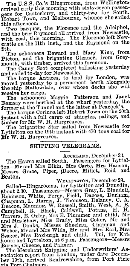 Tlie U.S.S. Co.’s Ringarooma, from Wellington, arrived early this morning with sixty-seven passengers for Canterbury, and thirty-two for South, Hobart Town, and Melbourne, whence she sailed this afternoon; , , . Two barques, the Florence and the Adelphoi, and the brig Raymond all arrived from Newcastle, with coal, this morning. The Florence left Newcastle on the 11th inst., and the Raymond on the The schooners Reward and Mary King, from Picton, and the brigantine Gleaner, from Greymouth, with timber, arrived this forenoon. The Canny Scot completed ballasting yesterday and sailed to-day for Newcastle. The barque Antares, to load for London, was moved yesterday to a permanent berth alongside the ship Mallowdalc, over whose decks she will receive her cargo. The schooners Maggie Patterson and Janet Ramsay were berthed at the wharf yesterday, the former at the Tunnel and the latter at Peacock’s. The barque Corinnaleft Hobart Town on the 20th instant with a full cargo of shingles, palings, and timber for Mr W. H. Hargreaves. The brigantine Star sailed from Newcastle for Lyttelton on the 19th instant with 470 tons coal for Mr W. H. Hargreaves. SHIPPING TELEGRAMS. Auckland, December 23. The Hftwca sailed South. Passengers for Lyttelton—Mr and Mrs Elkin, Mrs Carte, Mrs Hanson, Messrs Grace, Piper, (Dacre, Millet, Reid and Beaton. „ Wellinoton, December 23. Sailed—Ringarooma, for Lyttelton and Dunedin, about 2.30. Passengers—Messrs Gray, L. Blundell, Robinson, White, Percy, Field, Dacose, Durham, Chapman, L. Harris, J. Thomson, Delaney, C, A. Deacon, Manning, W. Russell, Smith, West, A. B. Campbell, E. Black, Caldwell, Potans, H. H. Travers, E. Oxley, Mrs E. Plummer and child, Mr and Mrs Shaw, Miss Brady, Miss Coker, Mr and Mrs J. Banks, Misses Sheehan, Chapman and Weber, Mr and Mrs Wills, Mr and Mrs Earl, Mrs Seager, Mrs Roxburgh and child. Tui, for KaiJcoura and Lyttelton, at 6 p.m. Passengers—Messrs Bnmes, Cheene, and Palmer. The Merchant Shipping and Underwriters’ Association report from London, under date December 19th, arrived Renfrewshire, from Port Piric via Port Chalmers.