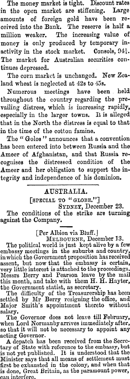 The money market is tight. Discount rates in the open market are stiffening. Large amounts of foreign gold have been received into the Bank. The reserve is half a million weaker. The increasing value of money is only produced by temporary inactivity in the stock market. Consols, 941. The market for Australian securities continues depressed. The corn market is unchanged. New Zealand wheat is neglected at 42s to 455. Numerous meetings have been held throughout the country regarding the prevailing distress, which is increasing rapidly, especially in the larger towns. It is alleged that in the North the distress is equal to that in the time of the cotton famine. The “ Golos ” announces that a convention has been entered into between Russia and the Ameer of Afghanistan, and that Russia recognises the distressed condition of the Ameer and her obligation to support the integrity and independence of his dominion. AUSTRALIA. [special to “globe.”] Sydney, December 23. The conditions of the strike are turning against the Company. [ Per Albion via Bluff.] Melbourne, December 13. The political world is just kept alive by a few embassy meetings in the suburbs and country, in which the Government proposition has received assent, but now that the embassy is certain, very little interest is attached to the proceedings. Messrs Berry and Pearson leave by the mail this month, and take with them H. H. Hayter, the Government statist, as secretary ._ The difficulty of the Treasurership has been settled by Mr Berry resigning the office, and Major Smith’s appointment thereto without salary. The Governor does not leave till February, when Lord Normanby arrives immediately after, so that it will not bo necessary to appoint any acting Governor. A depatch has been received from the Secretary of State with reference to the embassy, but is not yet published. It is understood that the Minister says that all means of settlement must first be exhausted in the colony, and when that is done, Great Britain, as the paramount power, can interfere.