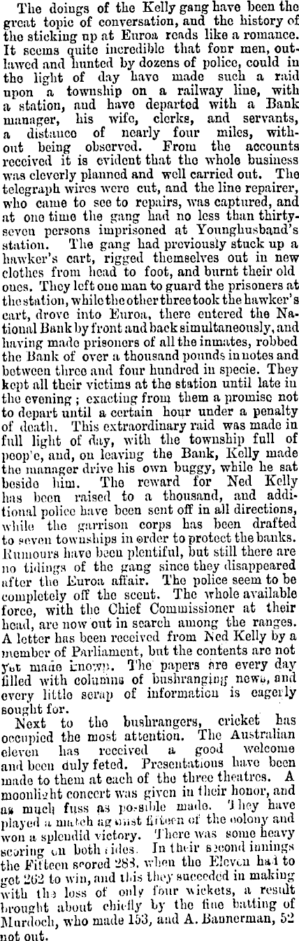 The doings of the Kelly gang have been the great topic of conversation, and the history of the sticking up at Enron reads like a romance. It seems quite incredible that four men, outlawed and hunted by dozens of police, could in the light of day have made such a raid upon a township on a railway line, with a station, and have departed with a Bank manager, his wife, clerks, and servants, a distance of nearly four miles, without being observed. From the accounts received it is evident that the whole business was cleverly planned and well carried out. The telegraph wires were cut, and the lino repairer, who came to see to repairs, was captured, and at one time the gang had no less than thirtyseven persons imprisoned at Younghusband’s station. The gang had previously stuck up a hawker’s cart, rigged themselves out in new clothes from head to foot, and burnt their old ones. They left one man to guard the prisoners at the station, win le the other three took the hawker'’s cart, drove into Enroa, there entered the National Bank by front and back simultaneously, and having made prisoners of all the inmates, robbed the Bank of over a thousand pounds in notes and between three and four hundred in specie. They kept all their victims at the station until late in the evening ; exacting from them a promise not to depart until a certain hour under a penalty of death. This extraordinary raid was made in full light of day, with the township full of poop'c, and, on leaving the Bank, Kelly made the manager drive his own buggy, while he sat beside him. The reward for Ned Kelly lias boon raised to a thousand, and additional police have been sent off in all directions, while the garrison corps has been drafted to seven townships in order to protect the banks. Rumours have been plentiful, but still there are no tidings of the gang since they disappeared ufler the Euroa affair. The police seem to be completely off the scent. The whole available force, with the Chief Commissioner at their head, are now out in search among the ranges. A letter has been received from Red Kelly by a member of Parliament, but the contents are not jr,t made known. The papers ere every day filled with columns of bushrangiog news, and every little scrap of information is eagcily sought for. ISlext to the bushrangers, cricket has occupied the most attention. The Australian eleven has received a good welcome and been duly feted. Presentations have been made to them at each of the three theatres. A moonlight concert was given in their honor, and as much fuss as possible made, 'i hey have played a match ugiiust fifteen of the colony and won a splendid victory. There was some heavy scoring on both tides. In their sjeond innings the Fifteen scored 288, when the Eleven had to get 262 to win, and this they sucecdcd in making with tin loss of only four wickets, a result brought about chiefly by the line batting of Murdoch, who made 163, and A. Bannerman, 62 not out.