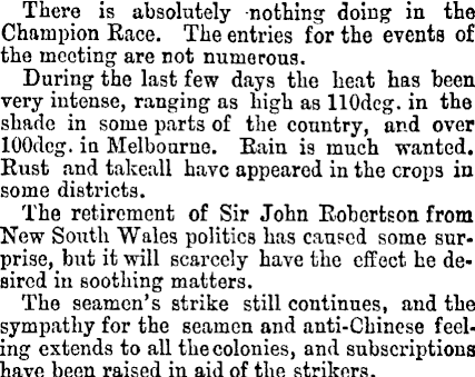 There is absolutely nothing doing in the Champion Race. The entries for the events of the mooting are not numerous. During the last few days the heat has been very intense, ranging as high as HOdcg. in the shade in some parts of the country, and over lOOdcg. in Melbourne. Rain is much wanted. Rust and takeall have appeared in the crops in some districts. The retirement of Sir John Robertson from New South Wales politics has caused some surprise, but it will scarcely have the effect he desired in soothing matters. The seamen’s strike still continues, and the sympathy for the seamen and anti-Chinese feeling extends to all the colonies, and subscriptions have been raised in aid of the strikers.