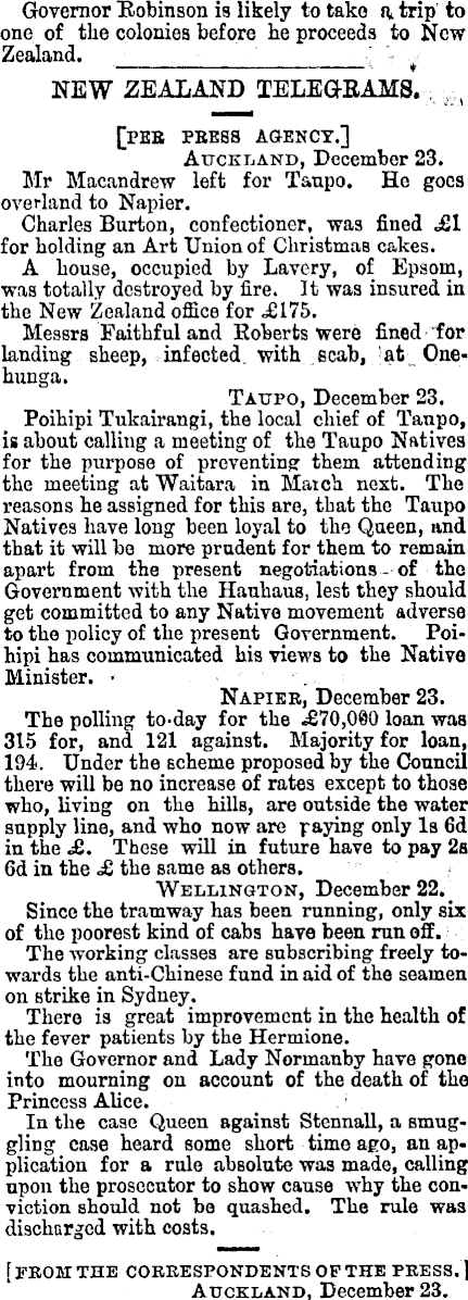 Governor Robinson is likely to take a trip to one of the colonies before he proceeds to New Zealand. NEW ZEALAND TELEGRAMS. [PEB PRESS AGENCY.] Auckland, December 23. Mr Macandrew left for Taupo. He goes overland to Napier. Charles Burton, confectioner, was fined £1 for holding an Art Union of Christmas cakes. A house, occupied by Lavcry, of Epsom, was totally destroyed by fire. It was insured in the New Zealand office for £175. Messrs Faithful and Roberts were fined for landing sheep, infected with scab, at Onehunga. Taupo, December 23. Poibipi Tukairangi, the local chief of Taupo, is about calling a meeting of the Taupo Natives for the purpose of preventing them attending the meeting at Waitara in March next. The reasons he assigned for this are, that the Taupo Natives have long been loyal to the Queen, and that it will bo more prudent for them to remain apart from the present negotiations of the Government with the Hauhaus, lest they should get committed to any Native movement adverse to tho policy of the present Government. Poihipi has communicated his views to the Native Minister. Napier, December 23. The polling to-day for the £70,000 loan was 315 for, and 121 against. Majority for loan, 194. Under the scheme proposed by the Council there will be no increase of rates except to those who, living on the hills, are outside the water supply line, and who now are paying only Is fid in the £. These will in future have to pay 2s fid in the £ the same as others. Wellington, December 22. _ Since the tramway has been running, only six of the poorest kind of cabs have been run off. The working classes are subscribing freely towards the anti-Chinese fund in aid of the seamen on strike in Sydney. There is great improvement in the health of the fever patients by the Hermione. The Governor and Lady Normanby have gone into mourning on account of the death of the Princess Alice. In the case Queen against Stennall, a smuggling case heard some short time ago, an application for a rule absolute was made, calling upon the prosecutor to show cause why the conviction should not bo quashed. The rule was discharged with costs. [ FROM THE CORRESPONDENTS OP THE PRESS. 1 Auckland, December 23.