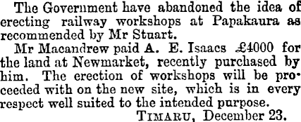 The Government have abandoned the idea of erecting railway workshops at Papakaura as recommended by Mr Stuart. Mr Macandrew paid A, E. Isaacs .£4OOO for the land at Newmarket, recently purchased by him. The erection of workshops will be proceeded with on the new site, which is in every respect well suited to the intended purpose. Timaru, December 23.