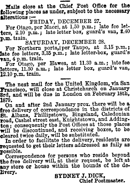 Mails olose at the Chief Post Office for the following places as under, subjeot to the necessary alterations: — FRIDAY, DECEMBER 27. For Otago, per Maori, at 1.50 p.m.; late fee letters, 2.10 p.m.; late letter box, guard's van, 2.40 ».m. tiain. SATURDAY, DECEMBER 28. For Northern ports.lper Taupo, at 3.15 p.m.; late fee letters, 3.35 p.m.; late letter-box, guard's tan, 4 p.m. train. For Otago, per Hawea, at 11.30 a.m.; late fee letters, 11.50 a.m.; late letter box, guard's van, 12.10 p.m. train. The next mail for the United Kingdom, via San Francisco, will close at Christchurch on January Brd, and will be due in London on February 18th, 1879 On and after 2nd January prox. there will be a free delivery of correspondence in the districts of St. Albans, Phillipstown, Bingsland, Caledonian toad, Cashel street east, Knightstown, and Adding. ton; consequently the Post Offices at those places Will be discontinued, and receiving boxes, to be cleared twice daily, will be substituted. In order to facilitate the delivery, residents are requested to get their letters addressed as fully as Correspondence for persons who reside beyond the free delivery will, at their request, be left at any store or house within the bounds of the deUvery. SYDNEY J. DICK, Chief Postmaster.
