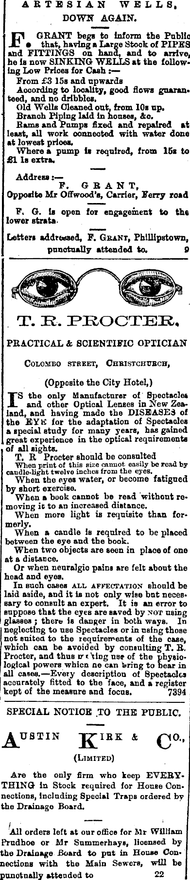 IA RTBS IA N WELLS, DOWN AGAIN. 1 GRANT begs to inform the Public : • that, having* Large Stock of PIPES and FITTINGS on hand, and to arrive, he 1b now SINKING WELLS at the following Low Prices for Cash : From £3 15s and upwards According to locality, good flows guaran. teed, and no dribbles. Old Wells Gleaned oat, from 10s up. Branch Piping laid In houses, &o. Bams and Pomps fixed and repaired at least, all work connected with water done at lowest prices. Where a pomp is required, from 15s to £1 Is extra. Address:— F. GBA NT, Opposite Mr Offwood's, Carrier, Ferry road F. G. Is open for engagement to the lower strata. Letters addressed, F. Grant, PhUlipstown, punctually attended to, 0 T. JR. PEOCTEE, PRACTICAL & SCIENTIFIC OPTICIAN Colombo street, Ckbistchubch, (Opposite the City Hotel,) "S the only Manufacturer of Spectacles _ and other Optical Lenses in New Zealand, and having made the DISEASES of the EYK for the adaptation of Spectacles a special study for many years, has gained great experience in the optical requirements of all sights. T. R Procter should be consulted When print of this size cannot easily be read by candle-light twelve inches from the eyes. When the eyes water, or become fatigned by short exercise. When a book cannot be read without removing ic to an increased distance. When more light is requisite than formerly. When a candle is required to be placed between the eye and the book. When two objects are seen in place of one at a distance. Or when neuralgio pains are felt about the hoad and eyes. In such eases all affectation should be laid aside, and it is not only wise bnt necessary to consult an expert. It is an error to suppose that the eyes are saved by SOT using glasses ; there is danger in both ways. In neglecting to nse Spectacles or in nsing those not suited to the requirements of the ease, which can be avoided by consulting T. B, Procter, and thuß u 'ting üb« of the physiological powers whicn ne can bring to bear in all cases.—Every description ot Spectacles accurately fitted to the face, and a register kept of the measure and focus. 7394 SPECIAL NOTICE TO THE PUBLIC. (Limited) Are the only firm who keep EVEBYTHING In Stock required for House Connectionß, Including Special Traps ordered by the Drainage Board. All orders left at our office for Mr William Prudhoe or Mr Summerhays, licensed by the Drainage Board to put in House Connections with the Main Sewers, will be punctually attended to 22 ,