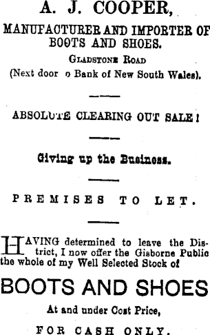 A. J. COOPER, MANUFACTURER AND IMPORTER OF BOOTS AND SHOES. Gladstone Road (Next door o Bank of New South Wales). ABSOLUTE CLEARING OUT SALE 1 Giving up the Business. PREMISES TO LET. HAVING determined to leave the District, I now offer the Gisborne Public the whole of my Well Selected Stock of BOOTS AND SHOES At and under Cost Price, FOR CASH ONLY.