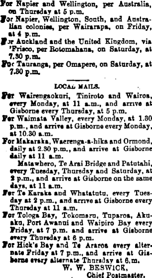 For Napier and Wellington, per Australia, on Thursday at 5 p.m. Vor Napier, Wellington, South, and Australian colonies, per Wairarapa, on Friday, at 4 p.m. fn Auckland and the United Kingdom, via 'Frisco, per Rotomahana, on Saturday, at 7.30 p.m. For Tauranga, per Omapere, on Saturday, at 7.80 p.m. LOCAr, mails. Fir Wairengaokuri, Tiniroto and Wairoa, every Monday, at 11 a.m., and arrive at Gisborne every Thursday, at 5 p.m. For Waimata Valley, every Monday, at 1.30 p.m., and arrive at Gisborne every Monday, at 10.30 a.m. For Makaraka, Waerenga-a-hika and Ormond, daily at 2 .30 p.m., and arrive at Gisborne daily at 11 a.m. Matawhero, Te Arai Bridge and Patutahi, every Tuesday, Thursday and Saturday, at 2 p.m., and arrive at Gisborne on the same days, at 11 a.m. For To Karaka and Whatatutu, every Tuesday at 2 p.m., and arrive at Gisborne every Thursday at 11 a.m. For Tologa Bay, Tokomaru, Tuparoa, Akuaku, Port Awanui and Waipiro Bay every Friday, at 7 p.m. and arrive at Gisborne ovary Thursday at 6 p.m. For Hick’s Bay and Te Araroa every alternate Friday at 7 p.m.. and arrive at Gisborne ovuy alternate Thursday at 6,m. W. W. BESWICK, Chief Postmaster.