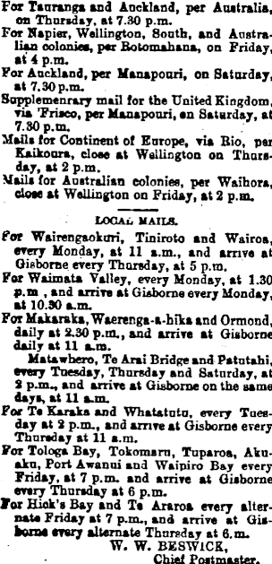 For Tauranga and Anckland, per Australia, on Thursday, at 7.30 p.m. For Napier, Wellington, South, and Australian colonies, per Rotomabana, on Friday, at’ 4 p.m. For Anckland, per Manapouri, on Saturday, at 7.30 p.m. Supplementary mail for the United Kingdom, via ’Frisco, per Manapouri, on Saturday, at 7.80 p.m. Mails, for Continent of Europe, via Rio, per Kaikoura, close at Wellington on Thursday, at 2 p.m. Mails for Australian colonies, per Waihora, close at Wellington on Friday, at 2 p.m. LOCAL MAILS. For Wairengaokuri, Tiniroto and Wairoa, every Monday, at 11 a.m., and arrive at Gisborne every Thursday, at 5 p.m. For Waimata Valley, every Monday, at 1.30 p.m , and arrive at Gisborne every Monday, at 10.30 a.m. For Makaraka, Waerenga-a-hika and Ormond, daily at 2.30 p.m., and arrive at Gisborne daily at 11 a.m. Matawhero, Te Aral Bridge and Patutahi, every Tuesday, Thursday and Saturday, at 2 p.m., and arrive at Gisborne on the same days, at 11 a.m. For Te Karaka and Whatatutu, every Tuesday at 2 p.m., and arrive at Gisborne every Thursday at 11 a.m. For Tologa Bay, Tokomam, Tuparoa, Akuaku, Port Awanui and Waipiro Bay every Friday, at 7 p.m. and arrive at Gisborne every Thursday at 6 p.m. For Hick’s Bay and Te Araroa every alternate Friday at 7 p.m., and arrive at Gisborne every alternate Thursday at 6.m. W, W. BESWICK, Chief Postmaster.