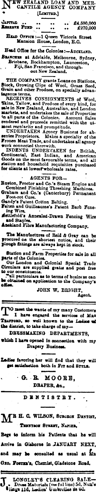 NEW ZEALAND LOAN AND MERCANTILE AGENCY COMPANY • [Limited.] CAkrrxi. £4.500,000 Rssxarz Fund £270,000 Head Office :—1 Queen Victoria Street Mansion House, London, E.C. Head Office for the Colonies:— Auckland. Blanches at Adelaide. Melbourne, Sydney, Brisbane, Rockhampton, Launceston, Fiji, San Francisco, and throughout New Zealand. THE COMPANY grants Loans on Stations, Stock, Growing Clips of Wool, Grass Seed, Grain and other Produce, on specially advan* tageous terms. RECEIVES CONSIGNMENTS of Wool, Skins, Tallow, and Produce of every kind, for sale in New Zealand, Australian, and London markets, and undertakes the sale of Properties -n all parts of the Colonies. Account Sales rendered and proceeds remitted with the utmost regularity and promptitude. UNDERTAKES Agency Business for absentee Proprietors. Makes a specialty of the Frozen Meat Trade, and undertakes all agency work connected therewith. INDENTS UNDERTAKEN for British, Continental, East Indian, and American Goods on the most favourable terms, and all station and household requisities purchased tor clients at lowest-wholesale rates. AGENTS FOR— Ruston, Proctor and Co.’s Steam Engine and Combined Finishing Threshing Machines. Graham and Co.’s (Canterbury) Permanent Foot-rot Cure. Gandy’s Patent Cotton Belting. Felten and Gnilleaume’s Patent Barb Fencing Wire. Nettlefold’s Annealed-Drawn Fencing Wire and Staples. Aukland Fibre Manufacturing Company. The Manufactures of Reid 4 Gray can be procured on the shortest notice, and their plough fittings are always kept in stock. Station end Farm Properties for sale in all parts of the Colonies. Our London and Colonial Special Trade Circulars are supplied gratis and post free to our constituents. particulars as to terms of busim se can be obtained on application to the Company’s office. JOHN W. BRIGHT, Agent. rpO meet the wants of my many Customers I have engaged the services of Mas Tbattobd, so well known to the Ladies of the district, to take charge of my— DRESSMAKING DEPARTMENTS, Which I have opened in connection with my Drapery Business. Ladies favoring her will find that they will got satisfaction both in Fit and Stylx. G. B. MOOSE, DRAPEB, 40., DENTISTRY. M B H. C. WILSON, Subgxon Dbntibt, Txsnybos Stbxzt, Nanzn, Begs to inform his Patients that he will Arrive in Gisborne in JANUARY NEXT, and may be consulted as usual at Mb Oxo. Foam’s, Chemist, Gladstone Road. J LONGLEY’S CLEARING SALE—- . Drove Materials (iiwful line) sd, Nun’s • lings Hd, Ladies’ Vuibrellaa 2t> tai.