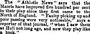 The “Athletic News ” says that the Maoris have improved five hundred per cent in their play since they first came to the North of England. “ Faulty picking up and poor passing were very noticeable,” says a reporter of that journal, “ when I saw them at Hull not long ago, and now they play like a book.”