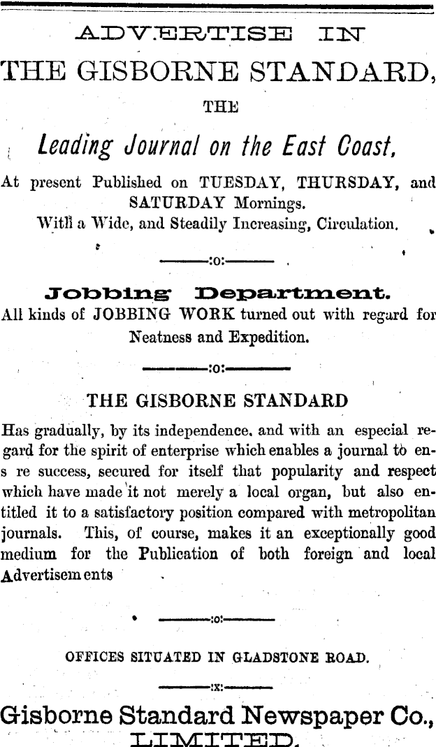 ADVBKTISE ITT THE GISBORNE STANDARD, THE Leading Journal on the East Coast, At present Published on TUESDAY, THURSDAY, and SATURDAY Mornings. With a Wide, and Steadily Increasing, Circulation. :o: . Jotofslxig; T>eE>abirtxxiexx't. All kinds of JOBBING WORK turned out with regard for Neatness and Expedition. :o: THE GISBORNE STANDARD Has gradually, by its independence, and with an especial regard for the spirit of enterprise which enables a journal to ens re success, secured for itself that popularity and respect which have made it not merely a local organ, but also entitled it to a satisfactory position compared with metropolitan journals. This, of course, makes it an exceptionally good medium for the Publication of both foreign and local Advertisements • - :0 !. . OFFICES SITUATED IN GLADSTONE ROAD. -" :x: Gisborne Standard Newspaper Co., IjTJSZETTZED.