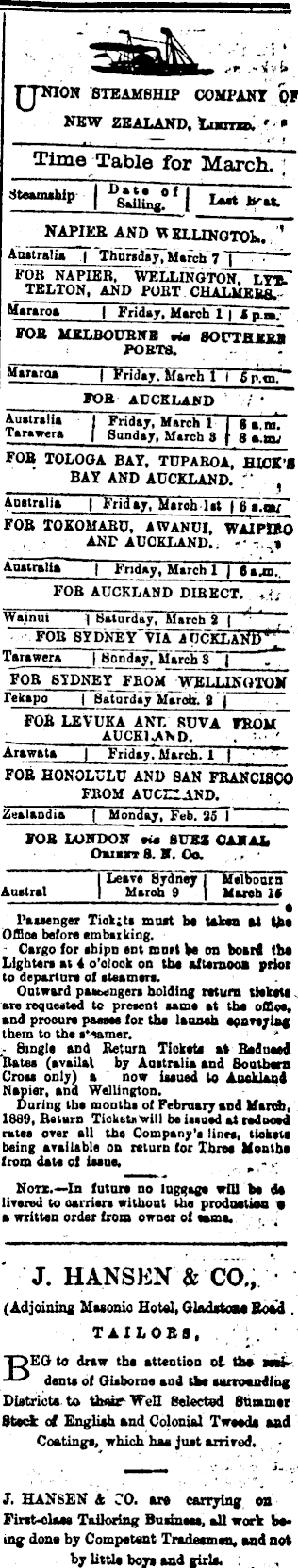 £JNION STEAMSHIP COMPANY OF NEW ZEALAND, Lktb. Time Table for March. Steamship [ 0f J Urt jxu. NAPIER AND W ELLINOTOk.. Anstralia | Thursday, March 7"j ~~ FOR NAPIER? WELLINGTOn7~LYtT TELTON, AND PORT CHALMEB& Mararoa | Friday, Mareh FOR MELBOURNE m SOUTH itnii PORTS. Mararoa | Friday. Mlrch 1 I FOR AUCKLAND Australia | Friday, March 1 I «a.m. Tarawera | Sunday, March 3j 8 a.m. FOB TOLOGA BAY, TUPABOA, HICK’S BAY AND AUCKLAND. Aostralia | Friday, March Ist | 6 «.W FOB TOKOMARU, AWANUI, WAIPtRO AND AUCKLAND. AustraHa | Friday, March 1 | fi ajn, FOR AUCKLAND DIRECT. Wainui | SaiurdayUMareh 2 | FOB SYDNEY - VIA Tarawera j SondayTMarchS | ~ FOR SYDNEY FROM WTCI.I.TNGTON Tekapo | Saturday March. 2 j FOB LEVUKA ANE SUVA FROM AUCKID. Arawata | Friday. March. 1 | FOB HONOLULU AND SAN FRANCISCO FROM AUCKLAND. Zealandia | Monday, Feb. 25 1 ' FOR LONDON vto SUEZ CANAL Oman 8. N. On. I LeaviTSydnejn Melbourn Austral | March 9 ] March If — e Passenger Tiok;ts must be taken at the Office before embarking. Cargo tor ihipn ent mart be on board the Lighters at 4 o’clock on the afternoon prior to departure of steamers. Outward pasMngers bolding return tlokete are requested to present same at the office, and procure paaaee for the launoh oonveyiag them to the Single and Return Tickets at Reduced Batea (availal by Australia and Southern Cross only) a now issued to Auckland Napier, and Wellington. During the months ot February and March, 1889, Return Tickets will be issued at redooed rates over all the Company’s linn, tiokeie being available on return for Three Montbe from date of issue, Nora.—ln future no luggage will be da livered to carriers without the prodnelion 0 a written order from owner of seme. J. HANSEN & CO., (Adjoining Masonic Hotel, Gladstone Road . TAILORS, "DEG to draw the attention ot the reeidenta of Gisborne and tho surrounding Districts to their Well Selected Summer Stock of English and Colonial Tweeda and Coatings, which has just arrived. J. HANSEN & CO. are carrying on First-class Tailoring Business, all work being done by Competent Tradesmen, and not by little boys and girls.