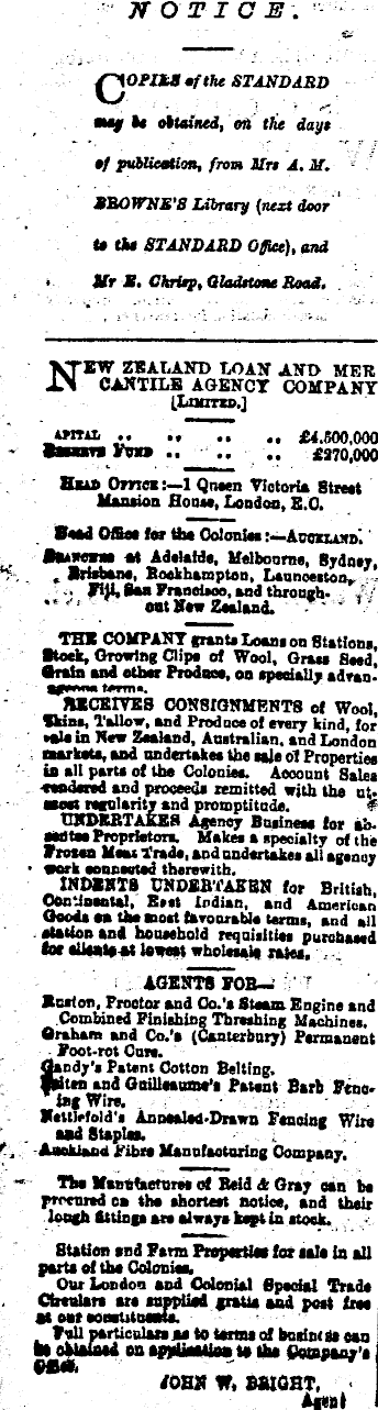 NOTI C E . {JORIESoftlie STANDARD be obtained, on the days of publication, from lire A. M. BROWNE'S Library (next door to the STANDARD Office), and Nr E. Chrirp, Gladstone Road, NEW ZEALAND LOAN AND MER CANTILE AGENCY COMPANY [Loans.] .. £4.500,000 hnm Fran £270,000 Head Omen:— l Qnsen Victoria Street Mansion Hones, London, E.U. Mead OSes for the ColoniesAccxtaxm Baawcne at Adelaide, Melbourne, Sydney, Brisbane, Rockhampton, Launceston, Fiji, San Francisco, and throughout Raw Zealand. THE COMPANY grants Loans on Stations, Stock, Growing Clips of Wool, Grau Seed, Grain and other Producs, on specially advanftppmwi tArm*. RECEIVES CONSIGNMENTS of Wool, Thins, Tallow, and Produce of every kind, for •ala in New Zealand, Australian, and London markets, and undertakes the sale of Properties in all parts of tbs Colonies. Account Sales wandered and proceeds remitted with the utmeet regularity and promptitude. UNDERTAKER Agency Business for ab. asatM Proprietors. Maltes a specialty of the Frozen Mau Trade, and undertakes all agenoy work connected therewith. INDENTS UNDERTAKEN for British, OonUMßtsl, B*tt Indian, and American Good* the moat Uvoorabla terms, and all station and household requisites purchased tor oUeateat lowest wholesale rates. AGENTS FOBRuston, Proctor and Co.'a Steam Engine and Combined Finishing Thrashing Machines. Graham and Co.’s (Canterbury) Permanent Foot-rot Cure. « indy’s Patent Cotton Belting. dteniandGuillssume’s Patent Barb Ftnclag Wire, NetUefold'a Annsalsd-Drawn Fencing Wire •od Staples. ' , dank land Fibre Manufacturing Company. Ths Manufactures of Beid <fc Gray can be procured cn ths shortest notice, and their lough Strings are always kept in stock. Station end Farm Properties for sale in all parte pf the CnlmnwL Our London and Colonial Special Trade Circulars ere supplied gratis aud post tree *t Nt MBBlltMMte Full particulars as to terms of burint ucau bloblataad on appUaaUM ta the Oatapaay'a *' JOHN W. BRIGHT, m*bl