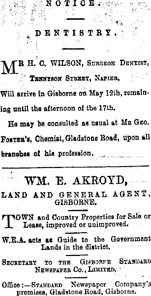 NOTICE. DENTISTRY. M E H. C. WILSON, Suf.gbon Dentist, Tennison Street, Napier, Will arrive in Gisborne on May 12th, remaining until the afternoon of the 17th. He may be consulted as usual at Mb Geo. Foster’s, Chemist, Gladstone Road, upon all branches of his profession. WM. E. AKROYD, LAND AND GENERAL AGENT, GISBORNE. TOWN and Country Properties for Sale or Lease, improved or unimproved. W.E.A. acts as Guide to the Government Lands in the district. Secretary to the Gisborne Standard Newspaper Co. , Limited. Office Standard Newspaper Company’s premises, Gladstone Road, Gisborne.