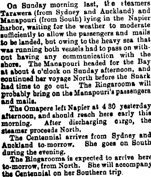 On Sunday morning last, ti e steamers Tarawera (from Sydney and Auckland) and Manapouri (from South) lying in the Napier harbor, waiting for the weather to moderate sufficiently to allow the passengers and mads to be landed, but owing to the heavy sea that was running both vessels had to pass on without having any communication with the shore. The Manapouri headed for the Bay at about 4 o’clock on Sunday afternoon, and continued her voyage North before the Snark had time to go out. The Ringarooma will probably bring on the Manapouri’s passengers and mails. The Omapere left Napier at 4 30 yesterday afternoon, and should reach here early this morning. After discharging Cirgo, the steamer proceeds North. The Centennial arrives from Sydney and Auckland to-morrow. She goes on South daring the evening. The Bingarooma is expected to arrive here to-morrow, from North. She will accompany the Centennial on her Southern trip