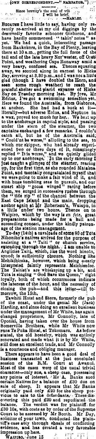 (OWN OOBBB3PONDBNT.—“ NABBATOB,”) Since brevity’s the soul of wit I will be brief. —Hamlet. Because I have little to say, having only re. cently re-arrived at my old diggings by the deservedly favorite schooner Gisborne, and have hardly commenced “ takin’ notes ” as yet. We had a quick, interesting passage from Baukokore, in tbe Bay nf Plenty, leaving there at 10 a.m., getting the full force of the tail end of the lata heavy Nor’wester, off Oreti Point, and weathering Cape Bunaway amid a very heavy, confused sea. Thence squaring away, we scooted along in earnest to Hicks Bay, arriving nt 3.80 p.rn,, and I was not a little glad (though I have doubled the Horn, and seen some rough weather) to reach the grateful shelter and placid expanse of Hicks Bay on Tuesday morning last. By Jove, Mr Editor, I’ve got a swimming sensation yet. Here we found the Australia, from Gisborne, at anchor. She had had a buck at it—literally—but adverse Bolus, and Neptune in a wax, proved too much for her. We beat up to the anchorage in capital style, and passing under the stern of the steamer, the two captains exchanged a few remarks. I couldn’t i catch ail, but he of the Australia said, t* Could'nt ba worse,” alluding to the sea, to which our skipper, who had already experienced two or three days of it, consolingly replied •* It is worse," and we quietly glided up to our anchorage, In the early morning I just caught a glimpse of the steamer, rearing up, for the first time, as she rounded Matakoa Paint, and mentally congratulated myself that we were going to make a fair wind of it, and with huge tumbling seas in pursuit, and our smart ship "goose winged" racing before them, we. surged in .successive rushes through the "tide rip’* of the channel between the East Cape Island and ths main, dropping anchor again at Mr Robertson's, Waiapu, in a little under two hours. Thence on to Waipiro, which by the way is en fete, great preparations being made for a hull and succeeding concert, under the kindly patronage of the station management. To-day (14thy a cavalcade of some 80 of Tata Nihoniho’a natives arrived for the purpose of assisting at a •• Taiti ” or church service, extending through the night. lam unable to Anglicise Taiti, which, like the word hinoto, synod; is sufficiently obscure. Nothing like Mehikihireka, however, which being nearly interpreted faintly represents Melchisedec. The Taitist’s are whiskeying up a bit, and Tuta is singing “ God Save the Queen,” right loyally, both of which occurrences indicate the lateness of tbe hour, and the necessity of closing the pub—and this lettgr—till tomorrow, the 15th, Tawhiti Hotel and Store, formerly the pub of the coast, under the genial Mr (Jack) Harding, and since doing an excellent business under the management of Mr White, has again changed proprietors, Mr Connolly, late of Opotiki, having taken over the house from Somerville Brothers, while Mr White now runs TePuka Hotel, at Tokomaru. As before stated, tbe old hostelry, which was entirely renovated and made what it is by Mr White, still does an excellent trade, and Mr Connally is a courteous and obliging manager. There appears to have been a good deal of business transacted at tbe just concluded session of the B.M. Court nt Awanui. Most of the cases were of the usual trivial character—only one, a sheep case, possessing any joints of interest, Mr A, Banks sued certain Natives for a balance of £3O due on sale of sheep. It appears that Mr Banks originally paid only £2O for the sheep previous to sale to the defendants. These discovering this paid £2O and repudiated the balance. The verdict was for plaintiff for £3O 10a, with costs as by order of the Supreme Court to be assessed by Mr Booth. Mr' Bay, solicitor of your town, conducted the plaintiff's case ably throngh sfioala of conflicting evidence, and has created a very favorable impression up here. Waipiro, June 15