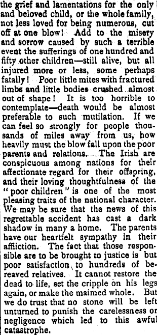 the grief and lamentations for the only and beloved child, or the whole family, not less loved for being numerous, cut off at one blow I Add to the misery and sorrow caused by such a terrible event the sufferings of one hundred and fifty other children—still alive, but all injured more or less, some perhaps fatally 1 Poor little mites with fractured limbs and little bodies crushed almost out of shape 1 It is too horrible to contemplate—death would be almost preferable to such mutilation. If we can feel so strongly for people thousands of miles away from us, how heavily must the blow fall upon the poor parents and relations. The Irish are conspicuous among nations for their affectionate regard for their offspring, and their loving thoughtfulness of the " poor children "is one of the most pleasing traits of the national character. We may be sure that the news of this regrettable accident has cast a dark shadow in many a home. The parents have our heartfelt sympathy in their affliction. The fact that those responsible are to be brought to justice is but poor satisfaction to hundreds of bereaved relatives. It cannot restore the dead to life, set the cripple on his legs again, or make the maimed whole. But we do trust that no stone will be left unturned to punish the carelessness or negligence which led to this awful catastrophe.