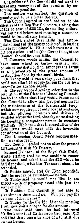 Cr Stubbs said the Council did not want to make any money out of the sureties by enforcing the penalties. # The motion was carried, the question of penalty not to be affected thereby. The Council agreed to send notices to the sureties of the Dog Tax Collectors, elating that if the balance of £36 10s, due on dog collars, was not paid before next meeting a summons would be immediately issued. The Clerk stated that Hills had appropriated some of the money collected, in buying horses for himself. Hills had horses now in hie possession, and he (the Clerk) thought the Council should first sue Hills. E. Cameron wrote asking the Council to have some wheat or barley crushed and poisoned for distribution amongst the farms ns a preventive of the great amount of destruction done by the small birds. Cr Tuohy said it was a very poor farm that could not afford to supply poison tor its own use.—Letter acknowledged. A, Devery wrote drawing attention to the resolution of the Gisborne Licensing Committee to the effect that they would recommend the Council to allow him £2O per annum for the maintenance of the Kaiteratahi ferry, which now required not only boat attendance, but also piloting horseman and drivers of vehicles across the ford, thereby necessitating his keeping a competent person in constant Waiting. He hoped that tho resolution of the Committee would moot with the favorable consideration ef the Council, The Licensing Committee's recommendation was also read. The Council decided not to altar the present arrangement with Mr Dsvery, Samuel Eviuson, of the Royal Oak Hotel, wrote stating that he was unable to renew his license, and asked that the £l2 which ho had deposited with tho Treasurer should be refunded, Cr Stubbs moved, and Cr King seconded, that the money be refunded.—Carried. Cr Tuohy said he would not like to see £lOO9 worth of property stand idle just for want of £l3. Cr Stubbs: The Council is not able to give time in these matters. Will you pay the balance of the license ? Cr Tuohy (to the Clerk): After the meeting I will give you a cheque for Hie amount. The Clerk said that be had informed Mr Scrivener that Mr Evinson had paid £l2 and that there was a balance of £l3 still due on the license.