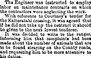 The Engineer was instructed to employ labor on maintenance contracts on which the contractors were neglecting the work. With reference to Courtney’s tender for the Kaiteratahi crossing, it was agreed that if he did not take up the contract it should be given to tho next lowest tenderer. It was decided to write to the rangor, informing him that complaints had been made about the number of animals that are to be found straying on tho County roads, and requesting him to be more attentive to his duties.