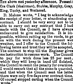 The above met yesterday afternoon. Present 1 Crs Clark (chairman), Stubbs, Murphy, Gray, King, Tuohy, and Wetherad. D. Malone wrote, “ I beg to acknowledge the receipt of your letter, re abandoning my contract. I should be very sorry not to be able to carry out any contract that I had made with the Council, as I have always endeavored to give satisfaction. It is impossible, without cutting up the roads, to go on with the work during the present wet weather, and I offer to the Council the following terms and trust they will be accepted, The contract to stop till the Engineer gives me instruction to resume work, The Council to pay for work done less 25 per cent., which they will keep in hand till finished, the Council to remit the penalty for overtime. I would remark that all the stone ia quarried, and that when tho Council sent the letter there were only five days over contract time. Of coursel stopped carting when the Council wrote.”