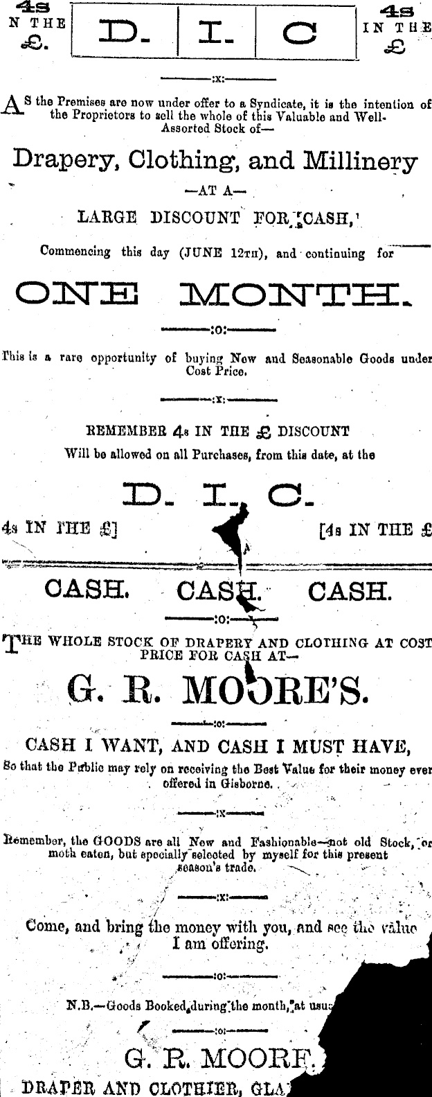 ■4:3 — - N TH E "T~> -r- X IN THE •sO. -L-- & :x: A S the Premises are now under offer to a Syndicate, it is the intention of the Proprietors to sell the whole of this Valuable aud WellAssorted Stock of— Drapery, Clothing, and Millinery —AT A—LARGE DISCOUNT FORJCASH,’ Commencing this day (JUNE 12m), and continuing for O2ST2E ZMIOdSTTZHA ———:o: This is a rare opportunity of buying New and Seasonable Goods under Cost Price. —— :X; BEMEMBEE 4s IN THE £ DISCOUNT Will be allowed on all Purchases, from this date, at the ZD. O4s IN THE £] [4 s IN THE £ CASH. CASH. :o:—y— WHOLE STOCK OF DRAPEBY AND CLOTHING AT COST PRICE FOE CASH AT— G. B. MOORE S. ■ ;o>—■ — CASH I WANT, AND CASH I MUST HAVE, Bo that the Pitblic may rely on receiving the Bost Value for their money ever offered in Gisborne. Remember, the GOODS are all Now and Fashionable —mot old Stock, or moth eaten, but specially selected by myself for this present season’s trade. n.i ■ . ;xi Come, and bring the money with you, and see the value x I am offering. I — -:o: N.B.—Goods Booked t during(the month,“at z — ;oi — G. R »ium and clothier,