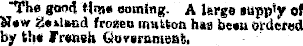 The good time coming. A large supply of New Zetland frozen mutton has beau ordered by t!i« Fretreh Guvornment,