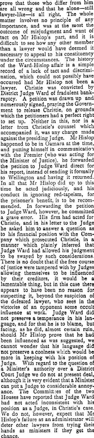 prove that those who differ from him are all wrong and that he alone —still lawyer-like—is all right. The whole matter involves no principle of any importance, and was at the most the outcome of misjudgment and want of tact on Mr Hislop’s part, and it is difficult to see how any other member than a lawyer would have deemed it necessary to appeal to his constituency under the circumstances. The history of the Ward-Hislop affair is a simple record of a lack of tact and discrimination, which could not possibly have occurred had Mr Hislop not been a lawyer. Christie was convicted by District Judge Ward of fradulent bankruptcy. A petition was drawn up and numerously signed, praying the Government to release Christie, on grounds which the petitioners had a perfect right to set up. Neither in this, nor in a letter from Christie’s counsel which accompanied it, was any charge made against the presiding Judge. Mr Hislop happened to be in Oamaru at the time, and putting himself in communication with the Premier (who was acting for the Minister of Justice), he forwarded the petition to Judge Ward direct for his report, instead of sending it formally to Wellington and having it returned. In all that Mr Hisiop did up to this time he acted judiciously, and his conduct in ignoring red-tapeism, for the prisoner’s benefit, is to be recommended. In forwarding the petition to Judge Ward, however, he committed a grave error. His firm had acted for Christie, and in his letter to the Judge he asked him to answer a question as to his financial position with the Company which prosecuted Christie, in a manner which plainly inferred that Judge Ward had allowed his judgment to be swayed by such considerations. There is no doubt that if the free corpse of justice were tampered with by Judges allowing themselves to be influenced by their creditors, it would be a lamentable thing, but in this case there appears to have been no reason for suspecting it, beyond the suspicion of the defeated lawyer, who sees in the victories of an opponent some occult influence at work. Judge Ward did not preserve a temperance in his language, and for that he is to blame, but facing, as he did, almost certain ruin, should Mr Hislop prove that he had been influenced as was suggested, we cannot wonder that his language did not preserve a coolness which would be more in keeping with his position of Judge. With regard to the question of a Minister’s authority over a District Court Judge we do not at present deal, although it is very evident that a Minister can put a Judge to considerable annoyance. The Committ.'es of the two Houses have reported that Judge Ward had not acted inconsistent with his position as a Judge, in Christie’s case. We do not, however, expect that Mr Hislop's failure as an administrator will deter other lawyers from trying their hands as ministers if they get the chance.