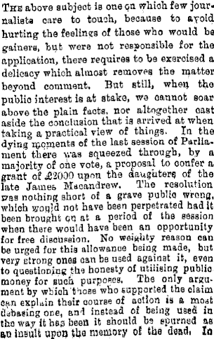 Ths above subject is one on which few journalista care to touch, because to avoid hurting the feelings of those who would be gainers, but were not responsible for the application, there requires to be exercised a delicacy which almost removes the matter beyond comment. But still, when the public interest is at stake, we cannot soar above the plain facts, nor altogether cast aside the conclusion that is arrived at when taking a practical view of things. In the dying njcnjents of the last session of Parliament there was squeezed through, by a majority of one vote, a proposal to confer a grant of £2OOO upon the daughters of the late James Macandrew. The resolution was nothing short of a grave public wrong, which wog’d not have been perpetrated bad it been brought on at a period of the session when there would have been an opportunity for free discussion. No weighty reason can be urged for thia allowance being made, hut very strong ones can ba used against it, even to questioning the honesty of utilising public money for such purposes. The only argument by which those who supported the claim can explain their course of action is a most cLbasing one, and instead of being Used in the way it hap been it should be spurned as au insult upon the memory of the dead. In