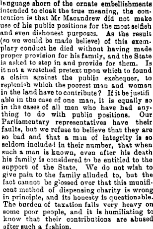language shorn of the ornate embellishments intended to cloak the true meaning, the contention in that Mr Macandrew did not make use of his public positions for the most selfish and even dishonest purposes. As the result (ao we would be made believe) of this exemplary conduct he died without having made proper provision for his family, and the State is asked to step in and provide for them. Is it not a wretched pretext upon which to found a claim against the public exchequer, to replenish which the poorest man and woman in the land have to contribute ? If it be justifi able in the case of one man, it is equally so in the cases of all men who have had anything to do with public positions. Our Parliamentary representatives have their faults, but we refuse to believe that they are so bad and that a min of integrity is so seldom included in their number, that when such a man is known, even after his death his family is considered to be entitled to the support of the State. We do not wish to give pain to the family alluded to, but the fact cannot be glossed over that this munificent method of dispensing charity is wrong in principle, and its honesty is questionable. The burden of taxation falls very heavy on some poor people, and it is humiliating to know that their contributions are abused after such a fashion.