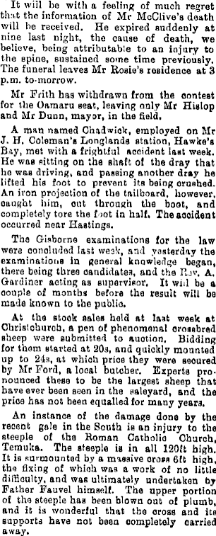 It will be with a feeling of much regret that the information of Mr McClive’s death will be received. He expired suddenly at nine last night, the cause of death, we believe, being attributable to an injury to the spine, sustained some time previously. The funeral leaves Mr Rosie’s residence at 3 p.m. to-morrow. Mr Frith has withdrawn from the contest for the Oamaru seat, leaving only Mr Hislop and Mr Dunn, mayor, in the field. A msn named Chadwick, employed on Mr J. H. Coleman’s Longhands station, Hawke’s Bay, met with a frightful accident last week. He was pitting on the shaft of the dray that he was driving, and passing another dray he lifted his foot to prevent its being crushed. An iron projection of the tailboard, however, caught him, out through the boot, and completely tore the foot in half. The accident occurred near Hastings. The Gisborne examinations for the law were concluded last week, and yesterday the examinations in general knowledge began, there being three candidates, and the Rjv. A. Gardiner acting as supervisor. It will be a couple of months before the result will be made known to the public. At the stock sales held at last week at Christchurch, a pen of phenomenal crossbred sheep were submitted to auction. Bidding for them started at 20s, and quickly mounted up to 245, at which price they were secured by Mr Ford, a local butcher. Experts pronounced these to be the largest sheep that have ever been seen in the paleyard, and the price has not been equalled for many years. An instance of the damage done by the recent gale in the South is an injury to the steeple of the Roman Catholic Church, Temuka. The steeple is in all 120 ft high. It is surmounted by a massive cross Oft high, the fixing of which was a work of no little difficulty, and was ultimately undertaken by Father Fauvel himself. The upper portion of the steeple has been blown out of plumb, and it is wonderful that the cross and its supports have not been completely carried away.