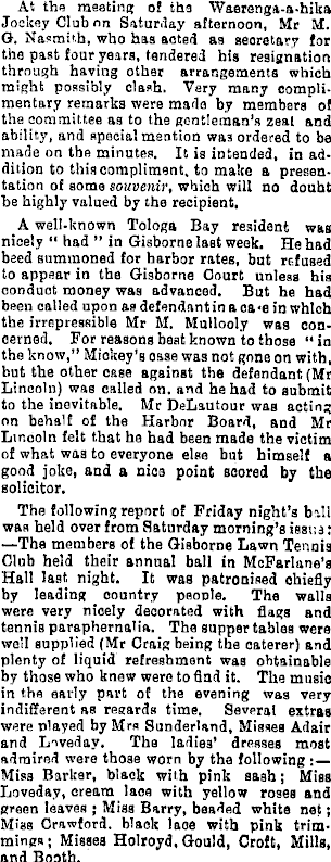At the meeting of the Waerenga-a-hika Jockey Club nn Saturday afternoon, Mr M. G. Nasmith, who has acted as secretary for the past four years, tendered his resignation through having other arrangements which might possibly clash. Very many complimentary remarks were made by members of the committee as to the gentleman’s zeal and ability, and special mention was ordered to be made on the minutes. It is intended, in addition to this compliment, to make a presentation of sovae souvenir, which will no doubt be highly valued by the recipient. A well-known Tologa Bay resident was nicely “ had ”in Gisborne last week. He had beed summoned for harbor rates, but refused to appear in the Gisborne Court unless his conduct money was advanced. But he had been called upon as defendant in a ca «e in which the irrepressible Mr M. Mullooly wag concerned. For reasons best known to those “in the know,” Mickey’s case was not gone on with, but the other case against the defendant (Mr Lincoln) was called on. and he had to submit to the inevitable. Mr DeLautour was acting on behalf of the Harbor Board, and Mr Lincoln felt that he had been made the victim of what was to everyone else but himself a good joke, and a nice point scored by the solicitor. The following report of Friday night’s ball was held over from Saturday morning’s issue: —The members of the Gisborne Lawn Tennis Club held their annual ball in McFarlane’s Hall last night. It was patronised chiefly by leading country people. The walls were very nicely decorated with flags and tennis paraphernalia. The supper tables were well supplied (Mr Craig being the caterer) and plenty of liquid refreshment was obtainable by those who knew were to find it. The music in the early part of the evening was very indifferent as resards time. Several extras were played by Mrs Sunderland, Misses Adair and Lnveday. The ladies’ dresses most admired were those worn by the following :— Miss Barker, black with pink sash; Miss Loveday, cream lace with yellow roses and green leaves • Miss Barry, beaded white net; Miss Crawford, black lace with pink trimmings ; Misses Holroyd, Gould, Croft, Mills, and Booth.