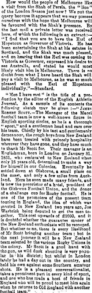 How would the people of Melbourne like a visit from the Shah of Persia, the “lion” of the London Season just now? We put the query because it appears that we may possess ourselves with the hope that Melbourne will be favoured with the Shah’s presence. By the last mail a private letter was received here, of which the following is an extract:— “I find that you are to have the Earl of Hopetoun as Governor of Victoria. He has been entertaining the Shah at his estates in Scotland, and the Shah was much pleased, anfl on hearing that the Earl was coming to Victoria as Governor, expressed his desire to see Australia, and stated he would most likely visit him in Melbourne. There is no doubt from what I have heard the Shah will pay a visit to Melbourne, as he was so much pleased with the Earl of Hopetoun individually.”—Standard. “ Men I have met ” is the title of a pro. duotion by the editor of the English Athletic Journal. As a sample of its contents the following sketch may be given :—“ James Robert Scott.—The Manager of the Maori foothall team is now a well-known figure in English sporting circles, as he is a thorough “ sport,” and a gentleman head and ears over his team. Chiefly by his tact and gentlemanly demeanour, the rough boys from New Zealand have been treated with princely hospitality wherever they have gone, and they have much to thank Mr Scott for. Their manager is an Englishman, born in London on January 31, 1851, who emigrated to New Zealand when only 18 years old, determined tn make a way for himself in our Colonies. Eventually he Battled down at Gisborne, a small place on the coast, and only a few miles from Auckland. Here he soon made many friends, and is now the proprietor of a hotel, president of the Gisbnme Football Union, and the donor of a challenge cup for Rugby football. He is one of the promoters of the present team touring in England, the idea of which was mooted in New Zealand two years ago, Joe Warbriok being deputed to get the men together. This cost upwards of £2OOO, and it is doubtful whether the guarantee money of the New Zealand enthusiasts will be recouped. But whether ot no, there is every likelihood of Mr Scott bringing another team ; but in the next journey it will be a New Zealand team selected by the various Rugby Unions in the colony. Mr Scott is a good hand with the gun, as wild duck shooting is very popular in his district; but whilst in London lately he had a day out in the country, and held his own against some Southern amateur shots. He is a pleasant conversationalist, takes a prominent part in every kind of sport, and one who has made a host of friends in England who will be proud to meet him again when he returns to Old England with another football team.”