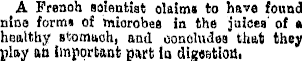 A French scientist claims to have found nine farms of microbes in the juices of a healthy stomach, and concludes that they play an important part in digestion.