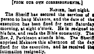 [from our OWN CORRXSFONDINM. j Napier, last night. The Sheriff has secured the services of a person to bang Makaore, and the date ot the execution has been fixed for next Saturday morning, at eight o’clock. Ho io rosigntd to his fate, and reads the Bible constantly. The Rav. J. Parkinson attends him. Th. Sb.riff apprised Makaore this afternoon of the day fixed for the execution, and he received th* intimation resignedly,