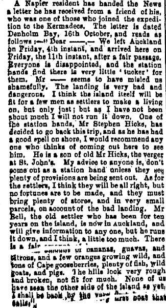 A Napier resident has handed the News a letter he has received from a friend of his, who was one of those who joined the expedition to the Eermadecs, The letter is dated Denholm Bay, 16lh October, and reads as follows I—ll Dear ,— We left Auckland on Friday, 4th instant, and arrived here on Friday, the 11th instant, after a fair passage. Everyone is disappointed, and the station hands find there la very little * tucker ’ for them. Mr — seems to have misled us shamefully, The landing is very bad and dangerous, I think the island itself will be fit for a few men as settlers to make a living on, but only just; bnt as I have not been About much I will not run it down, One of the station hands, Mr Stephen Hicks, has decided to go back this trip, and as he has had a good spell on shore, I would recommend any one who thinks of eoming out here to see him. He is a son of old Mr Hicks, the verger at St. John’s. My advice to anyone is,'don't gome out as a station band unless they nee plenty of provisions are being sent out. As for the settlers, I think they will be all right, but no fortunes are to be made, and they must bring plenty of stores, and in very small parcels, on account of the bad landing, Mr Bell, the old settler who hae been for ten years on the island, is now in Auckland, and will give information to any one, but he runs it down, and I think, a little too much. There 11 • www w ’oananM, guavas, and Citrons, and a few oranges growing wild, and ions of Cape gooseberries, plenty of fish* ynld goats, and pigs. 1 he hills look very rough and broken* not fit for much. None of us have sMi the other side of the folwd *i y«t a*