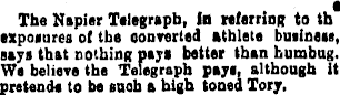 The Napier Telegraph, in referring to th exposures of the converted athlete business, eays that nothing pays better than humbug. We believe the Telegraph pays, although it pretends to be such a high toned Tory,