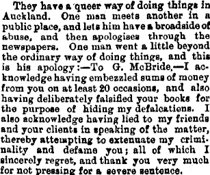 They have a queer way of doing things in Auckland. One man meets another in a public place, and lets him have a broadside of abuse, and then apologises through the newspapers. One man went a little beyond the ordinary way of doing things, and this is hie apologyTo G. Mcßride,—l acknowledge having embezzled sums of money from you on at least 20 occasions, and also having deliberately falsified your books for the purpose of hiding my defalcations, I also acknowledge having lied to my friends and your clients in speaking of the matter, thereby attempting to extenuate my criminality and defame you; all of which I sincerely regret, and thank you very much for not pressing for a severe sentence.