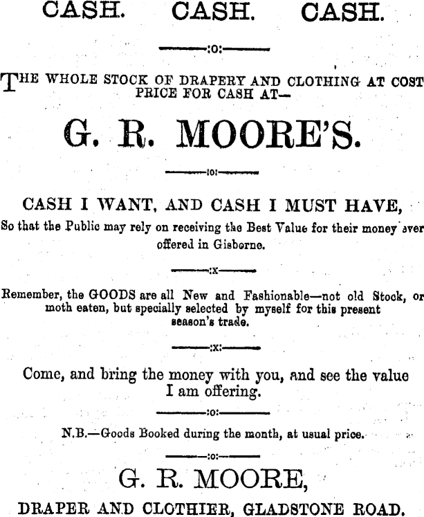 CASH. CASH. CASH. - :o: HPHE WHOLE STOCK OF DRAPERY AND CLOTHING AT COST PRICE FOR CASH AT— G. R. MOORE’S. CASH I WANT, AND CASH I MUST HAVE, So that the Public may rely on receiving the Best Value for their money aver offered in Gisborne. - -:x - Remember, the GOODS are all New and Fashionable—not old Stock, or moth eaten, but specially selected by myself for this present season’s trade. :x: ' - Come, and bring the money with you, and see the value I am offering. :o: N,B.—Goods Booked during the month, at usual price. G. R. MOORE, DRAPER AND CLOTHIER, GLADSTONE ROAD.