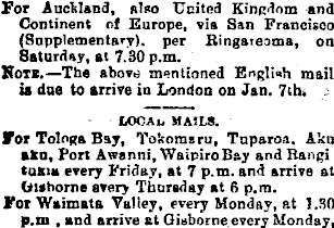 For Auckland, also United Kingdom and Continent of Europe, via San Francisco (Supplementary), per Bingareama, on Saturday, at 7.30 p.tn. Note.—The above mentioned English mail is due to arrive iu London on Jan. 7th. LOCAi. MAILS. For Tolnga Bay, Tokomsru, Tuparoa. Aku aku, Port Awanni, Waipiro Bay and Bangi tuxia every Friday, at 7 p.m. and arrive at Gisborne every Thursday at 6 p.m. ForWaimata Valley, every Monday, at 1.30 p.m , and arrive at Gisborne every Monday,