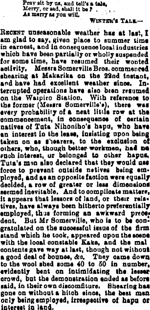 Pray alt by us, and tell’s a tale, Merry, or sad, shall it be ? As merry as you will. Winter's Talk— Rkcxnt unseasonable weather has at last, I am glad to say, given place to summer time in earnest, and in consequence local industries which have been partially or wholly suspended for some time, have resumed their wonted activity. Messrs Somerville Bros, commenced shearing at Mskarika on the 22nd instant, and have had excellent weather since. Interrupted operations have also been resumed on the Waipiro Station. With reference to the former (Messrs Somerville's), there was every probability of a neat little row at the commencement, in consequence of certain natives of Tata Nihoniho’s hapu, who have an interest in the lease, insisting upon bsing taken on as Ihsarers, to the exclusion of others, who, though better workmen, had no such interest, ur belonged to other hapus. Tula’s men also declared that they would use force to prevent outside natives being employed, and as an opposite faction were equally decided, a row of greater or leu dimensions seemed inevitable. And to complicate matters, it appears that lessors of land, or their reletives, have always been hitherto preferentially employed, thus forming an awkward precedent. But Mr Somerville, who is to be congratulated on the suooeutul issue of tbe firm stand which he took, appeared upon the scene with tbe local constable Kake, and the mal contents gave way at last, though not without a good deal of bounce, <fco. They came down to the wool shed soma 40 to 50 in number, evidently bent on intimidating the lesser crowd, but the demonstration ended as before said, in their own discomfiture. Shearing has gone on without a hitch since, the best men only being employed, irrespective of hapu ot intereet in lend.